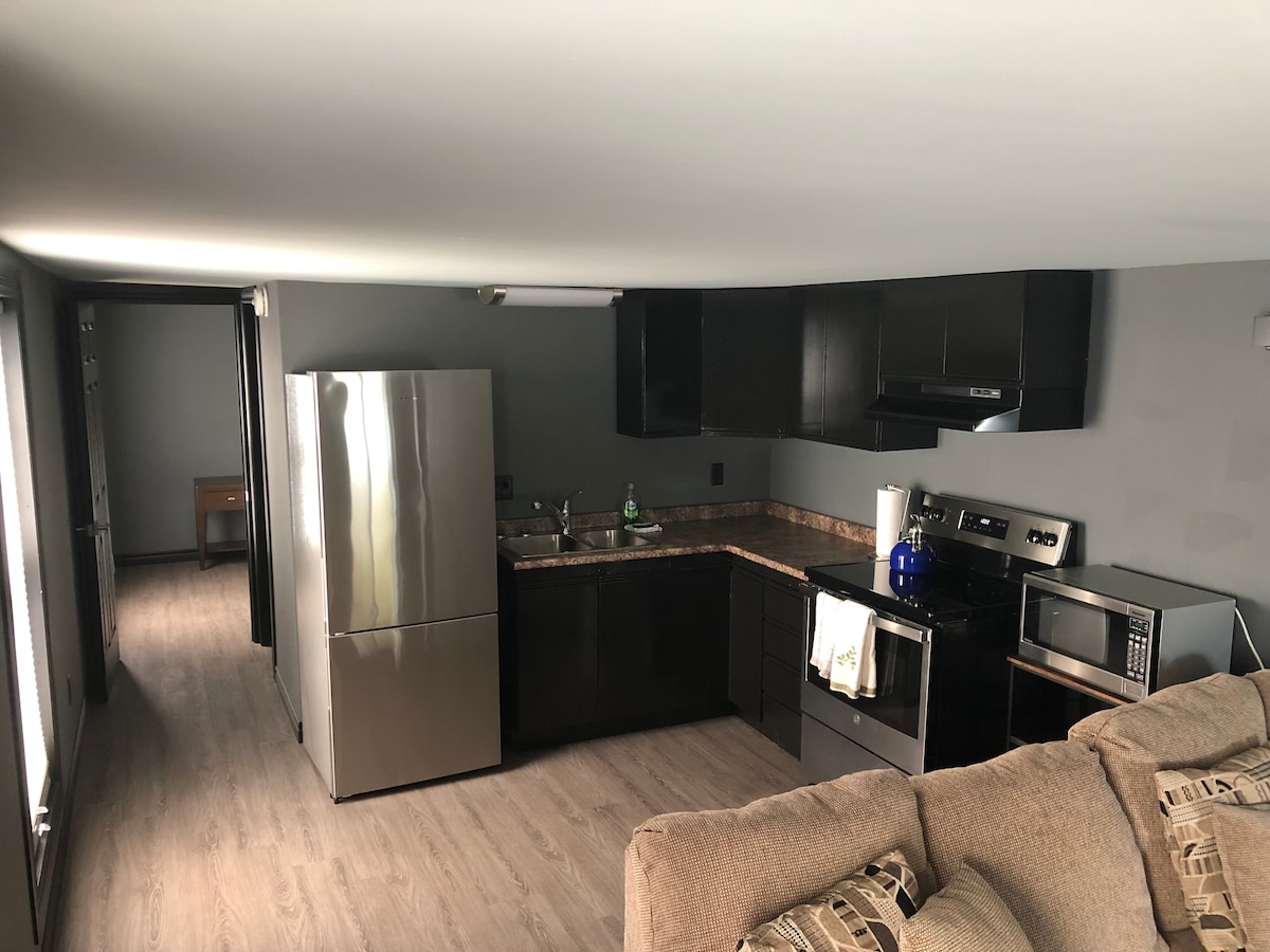 Forget your worries in this quiet and comfortable 1 bedroom basement apartment. Bedroom has a comfortable queen bed - perfect for the solo traveller or couple. Fully equipped kitchen with all your cooking essentials and a spacious washroom with walk-in shower. Come kick back and relax in your own space.