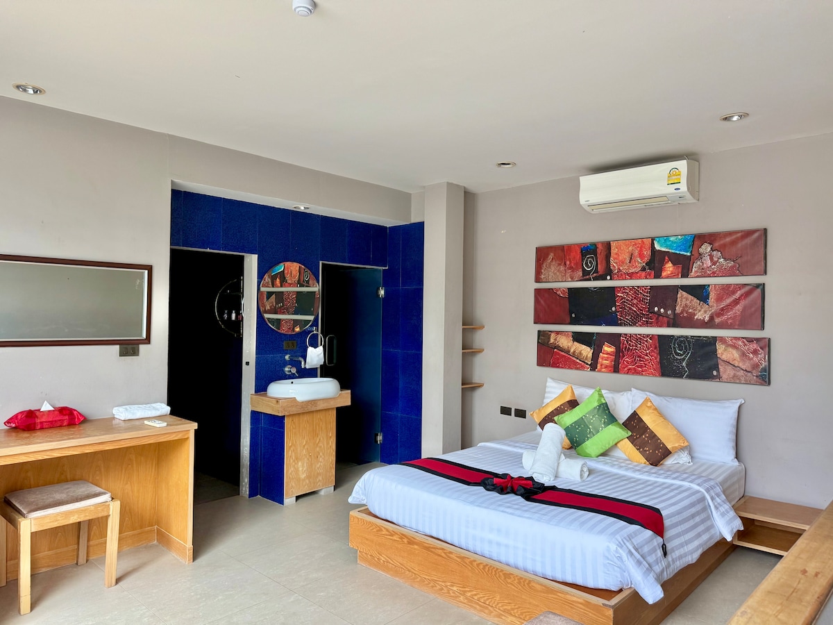 Кімната в балійському стилі характеризується дерев’яними арочними дверима та вікнами, що створюють тепле, приватне та розслаблююче відчуття. Прикрашені автентичними дерев’яними матеріалами, природні тони та теплі лампи створюють атмосферу, ідеальну для чистого відпочинку. Усередині кімнати є велике ліжко, темно-зелена штора в курортному стилі, письмовий/туалетний столик, телевізор і суміжна ванна кімната. Ідеально підходить для пар, мандрівників або тих, хто шукає спокійного відпочинку поблизу Рибальського селища, Ко Самуї.