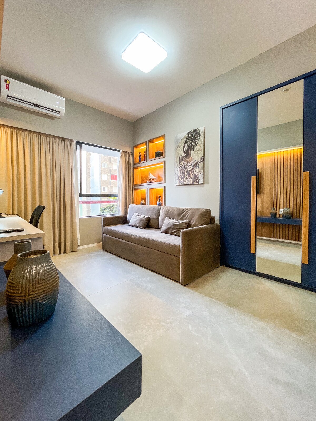 Aconchegante apto de 1 quarto para até 5 pessoas, no melhor ponto de Boa Viagem, perto da praia. Possui sala, cozinha equipada e banheiro, com conforto e praticidade. Condomínio com piscina, academia, área de lazer e recepção 24h. Restaurante, mini mercado e lavanderia no local. Café da manhã não incluso na diária, podendo ser contratado e pago à parte direto ao restaurante. Aproveite a ótima localização, a poucos passos do mar!