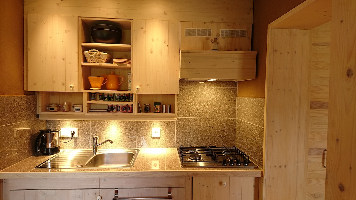 Будинок для відпочинку площею 55м ² пропонує затишну атмосферу з підлоговими дошками, відкритою вітальнею, диваном, плетеним кріслом, супутниковим телебаченням, музичною системою, дров 'яною піччю та виходом на балкон із зоною відпочинку, шезлонгами та видом на луки та ліс. Спальня з двоспальним ліжком (180x200 см) та м 'якими кольорами. Простора ванна кімната з душовою кабіною, туалетним приладдям, рушниками та феном. Зручності: WLAN, кондиціонер, парковка, місце для зберігання велосипедів, пральна машина, посудомийна машина, мікрохвильова піч, плита/духовка, холодильник.