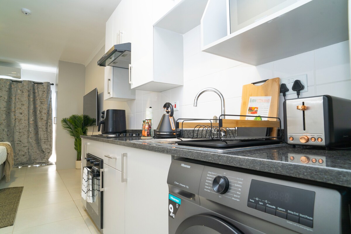 Сучасні апартаменти з 1 спальнею пропонують спокійний відпочинок у центрі Кгале-В’ю, розташовані в тихому та безпечному комплексі Motswedi Place Apartments. Спальня обладнана високоякісним ліжком розміру Queen size, пральною машиною з сушкою, красиво облаштованою телевізійною зоною, де гості можуть насолоджуватися кінематографічним досвідом завдяки DStv (обмежені канали) та Netflix. Гості також можуть скористатися безкоштовним Wi-Fi, повністю обладнаною кухнею, кондиціонером та цілодобовою охороною.