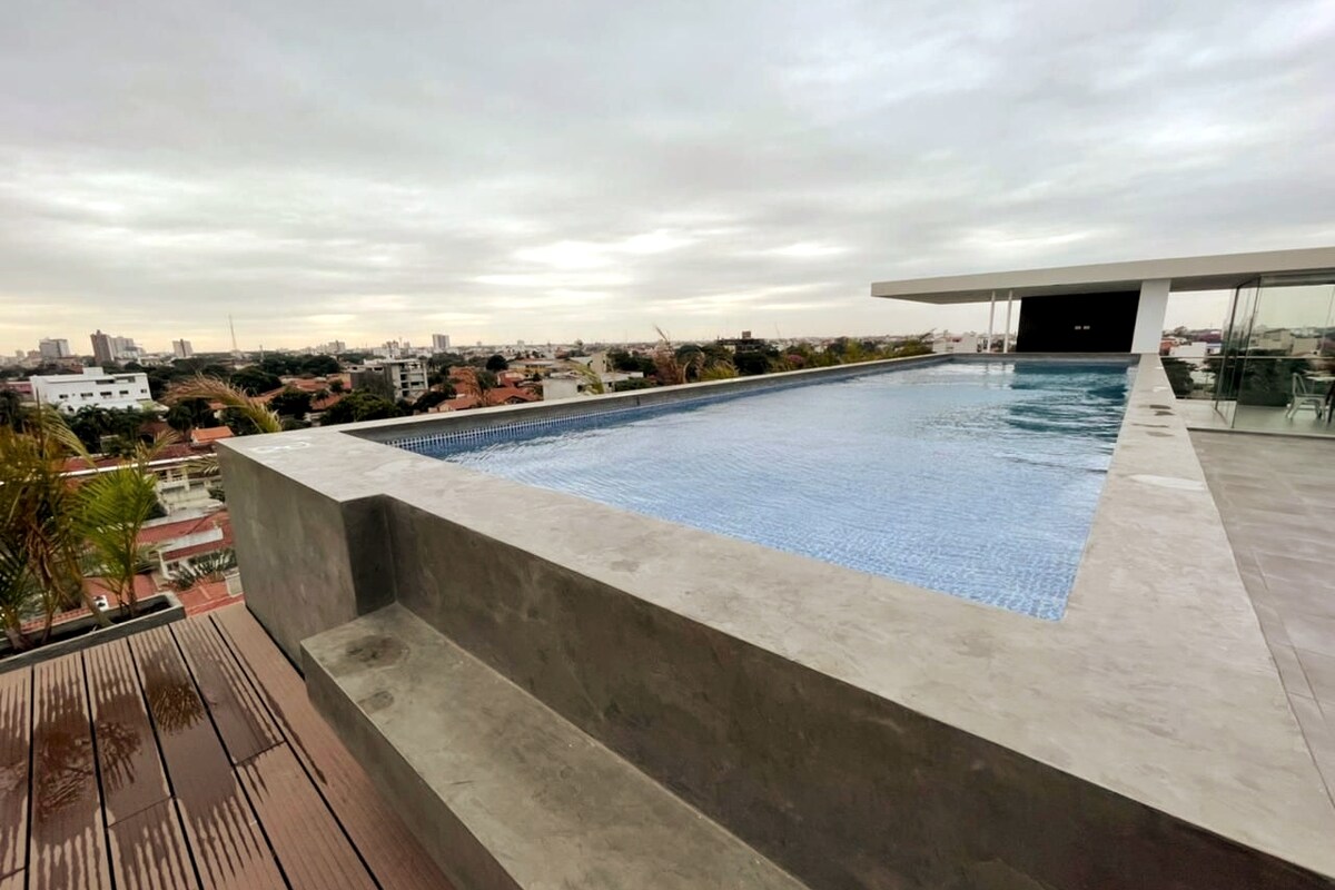 Я вітаю вас у розкоші, комфорті та чистоті цієї квартири в найкращому місці Кочабамби. Ви будете в найкращому районі для ділових або сімейних відпусток. - 80-дюймовий смарт-телевізор - Поруч із традиційними болівійськими ринками. - Ресторани поблизу. - Панорамний басейн. - Софа-ліжко. - Дивовижний краєвид на місто. - Пральна машина.