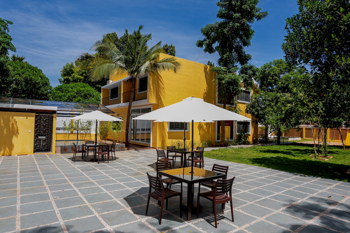 Сучасна вілла в найкращому Ауровілі з приватним басейном, оточена зеленню. До кафе можна дійти пішки, недалеко від пам 'яток і всього за 5–10 хвилин до пляжу. Просторі спальні, балкон, сад і сидіння біля басейну ідеально підходять для сімей, пар або груп, які шукають комфорту, усамітнення та відпочинку. ПРИМІТКА. Я не буду на зв 'язку з вами, хлопці, Це буде пан САНДЖАЙ власник помешкання, який зв 'яжеться з вами з моменту бронювання. Дякуємо!