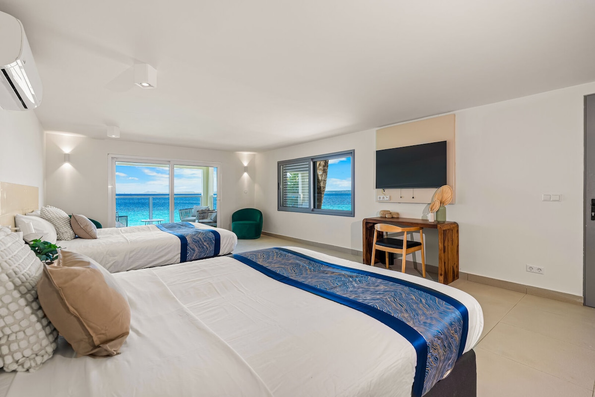 Our Oceanfront Quadruple Room at Boutique Hotel Bougainvillea brings you as close to the sea as possible for an unforgettable stay. This spacious room features two king-size beds, a large bathroom, Nespresso coffee machine, kettle, mini fridge and a private balcony directly overlooking the ocean. Enjoy the sound of the waves, take in the beautiful view of Kralendijk and Klein Bonaire and the fresh sea breeze while relaxing in comfort and style.