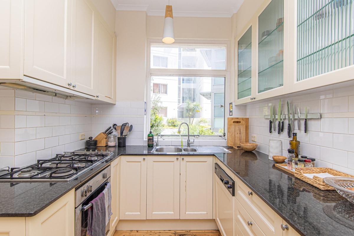 Відпочиньте та розслабтеся в цьому спокійному, стильному помешканні. 1 спальня, нещодавно відремонтована квартира на першому поверсі (без сходів), кондиціонер, приватне патіо на відкритому повітрі, барбекю, кавоварка, мікрохвильова піч, духовка, Sonos, пральна/сушильна машина, спільний дах з панорамним видом. 5 хвилин ходьби до пляжу Бонді, прибережної прогулянки та кафе, 1 хвилина ходьби до автобусної зупинки. З парковкою.
