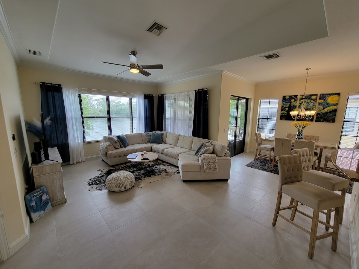 Це чудовий будинок із 3 спальнями та 2 ванними кімнатами в новому стані з абсолютно новими меблями, готовими для відпочинку. Це помешкання розташоване на південному заході Кейп-Корал неподалік від магазинів, чудових ресторанів, 27-лункового поля для гольфу в Кейп-Рояль. Розташоване в тихому районі на великій ділянці з 3 ділянками з величезним приватним огородженим заднім двором. У помешканні є Wi-Fi, кабельне телебачення, повне обслуговування газону, вам не потрібно нічого робити, просто візьміть із собою одяг і зубну щітку.