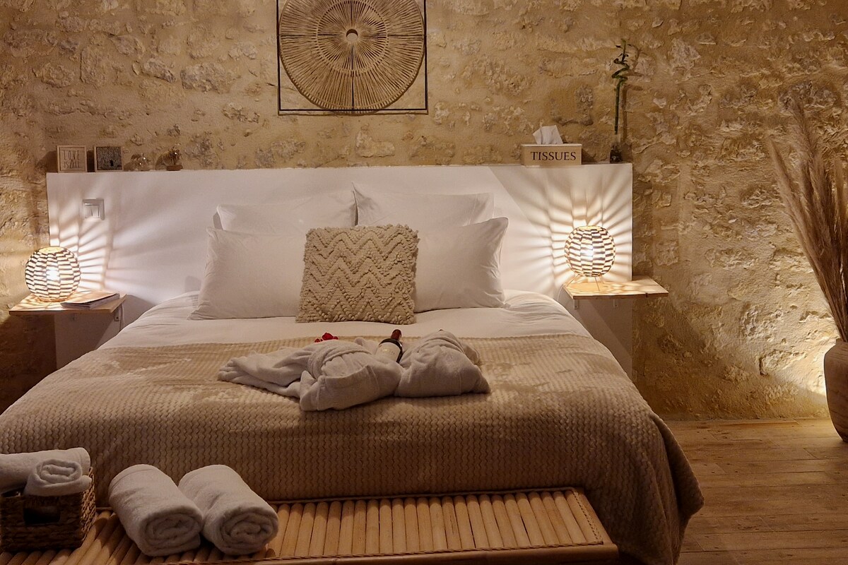 Побалуйте себе дублями в центрі виноградників. Наш люкс, ідеально розташований у Монтань-Сен-Емільйон, зачарує вас своїм спокоєм. Думав запропонувати вам найкращий комфорт: висококласна постільна білизна розміру King size, підключений телевізор,Netflix,Alexa,міні-кухня, винний погріб... Надаються простирадла,рушники,халати. Незалежний доступ. Насолоджуйтеся басейном з підігрівом і джакузі на нашій території. Масаж і сніданки доступні Ми у вашому розпорядженні для будь-яких особливих запитів.