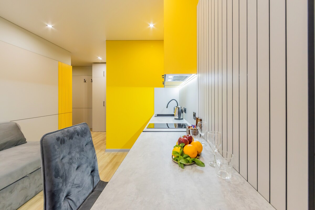 Сучасні апартаменти-студії з новим дизайнерським ремонтом у стильних сіро-жовтих тонах створюють атмосферу затишку та комфорту. У студії є велике ліжко з ортопедичним матрацом, кондиціонер, телевізор, швидкісний Wi-Fi, повністю укомплектована кухня та сучасна душова кімната. Ідеальний варіант для комфортного відпочинку після насиченого дня — як для подорожей, так і для тривалого проживання.