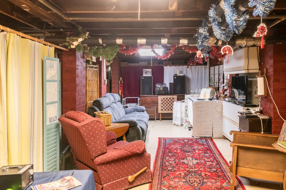 Convenient to the beauty of Mountains. The basement has a kingsize bed, 2 queen size bed, and a small den. It is suitable for the young, working groups and sporting groups who appreciate the privacy of a large quiet space. Unfortunately is not appropriate for children under 12 or people with more than moderate allergies. The toilet and sink are on the first floor and shower are on the second floor. I say this as many are surprised it is a " basement Apartment and is non-refundable.