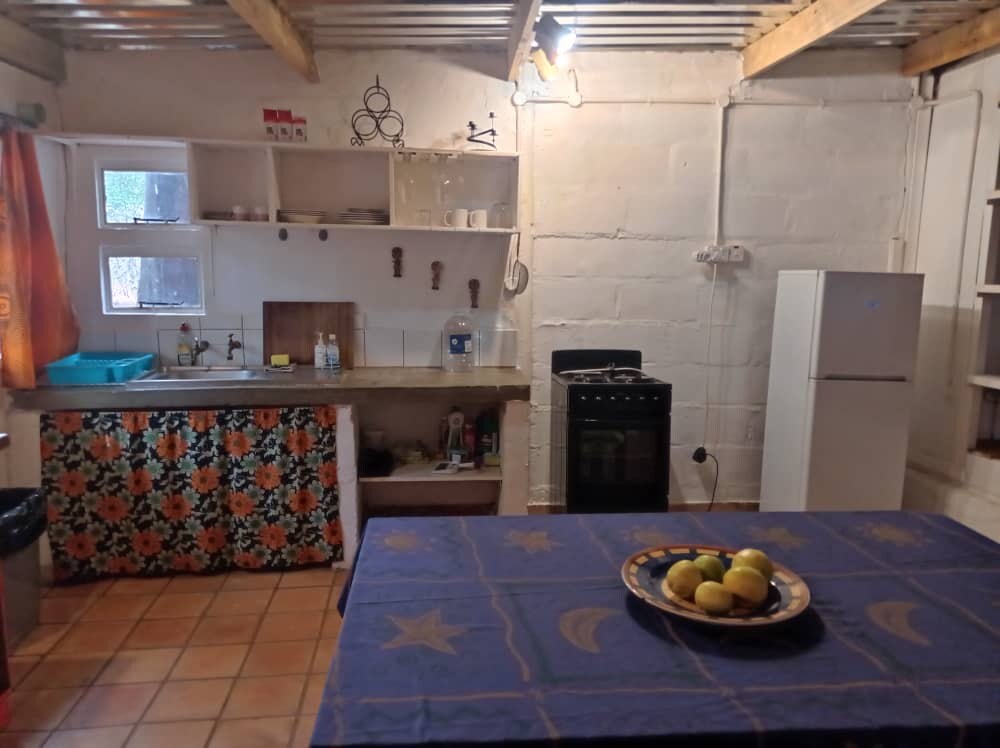 Guest house a few metres away from main house. It consist out of a big bedroom, small kitchen unit with fridge, microwave, two burner stove and a kettle. A small bathroom with shower, toilet and sink. The guest house has its own geyser, air conditioning, TV and fans and heater on demand. It also has a small private veranda. The washing machine can be used on demand for a small fee of P40 for each load. Guests should be animal friendly, big dogs, cats, rabbits and chickens on property.