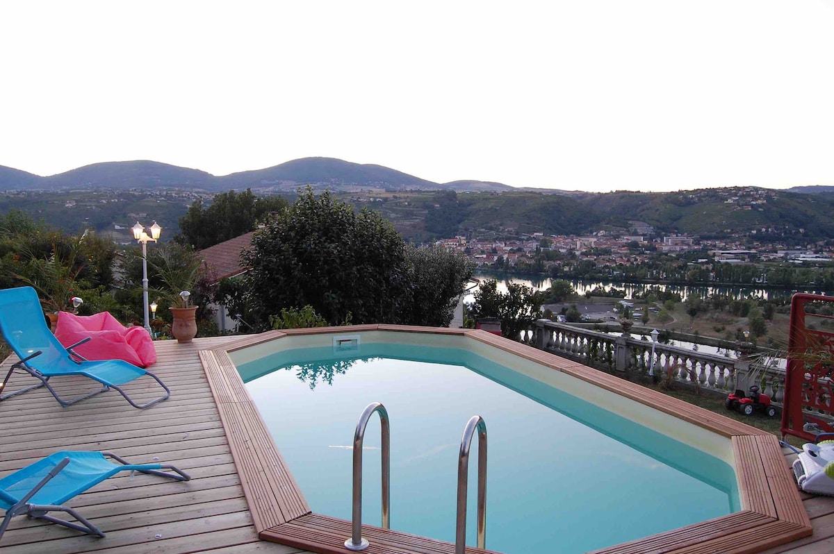Приголомшливий вид на Рону та озеро; 25 хвилин від Ліона. Вілла на першому поверсі, кімната, веранда, джакузі / сауна, за плату 200 євро/за сім 'ю за 2 дні, без зупинки, безкоштовний басейн, риболовля, катання на водних лижах на озері. Мінімальна тривалість БРОНЮВАННЯ становить 2 дні, у липні та серпні - мінімум 7 днів. Ціна вказана для 4 осіб, якщо + додаткова плата в розмірі 40 € за дорослого та 30 дол. США для дітей до 17 років і безкоштовно для немовлят - 2 роки оплачується на місці, без візитів, вечірок або нічного шуму