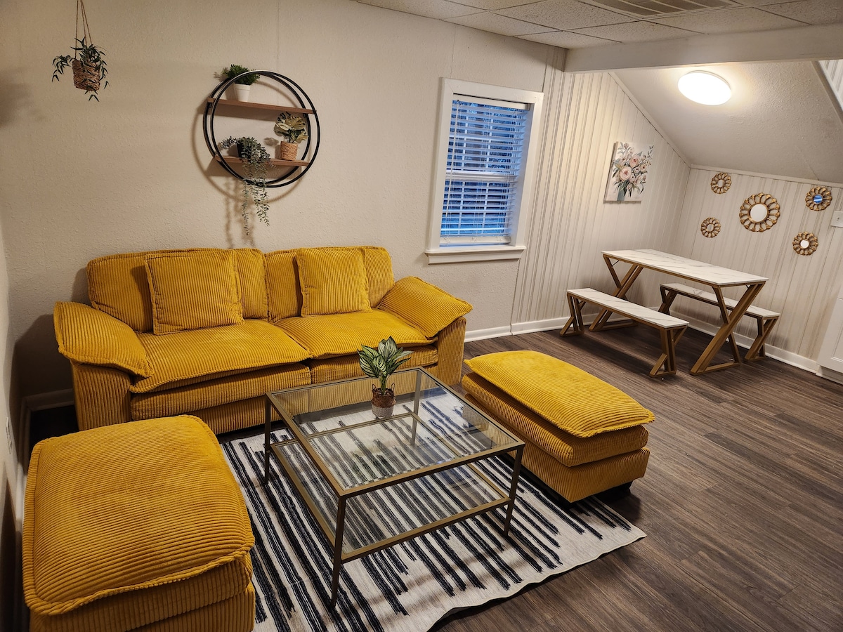 Вам буде комфортно в цьому просторому люксі з однією спальнею. У вас є власна кухня, пральна/сушильна машина та вітальня з великими телевізорами у спальні та вітальні. Щоб відпочити від дня, зайдіть у великий красивий душ із нескінченною гарячою водою. Спробуйте диван у вітальні висуватися на спальне місце під час перегляду телевізора або використовувати його як додаткове ліжко. Вхід/вихід через окремий вхід. Лише ви матимете доступ до свого помешкання. Чистота та привабливість. Гостюйте на день або на деякий час!