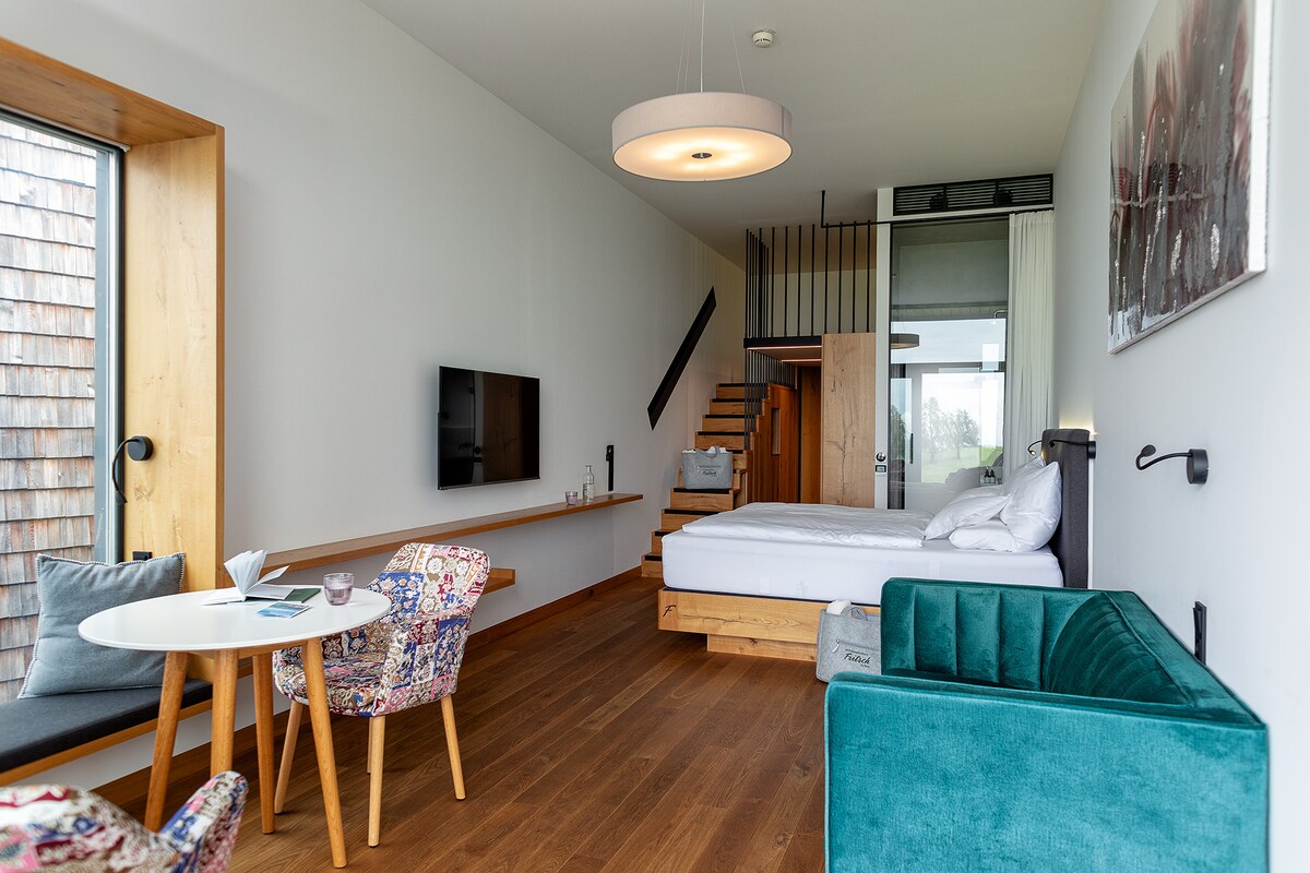 Erleben Sie außergewöhnlichen Komfort und stilvolles Design in unseren exklusiven Freiraum-Chalets im Erdgeschoss und Teilseeblick. Mit 40 m² Wohnfläche und einer beeindruckenden Raumhöhe von 3,5 Metern bieten sie ein einzigartiges Gefühl von Weite und Eleganz. Dank der durchdachten Architektur, nachhaltiger Bauweise und hochwertiger Ausstattung genießen Sie puren Luxus inmitten einer atemberaubenden Naturlandschaft.