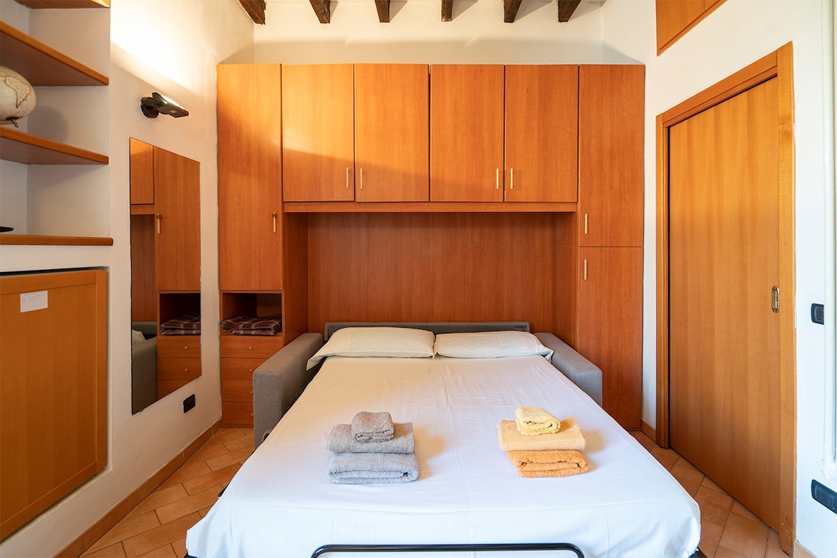 Uno spazioso bilocale con travi a vista appena ristrutturato. E' composto da un soggiorno con un delizioso camino e divano letto, una cucina (separata dal resto della casa), una camera matrimoniale con letto queen size ed un bagno con doccia.