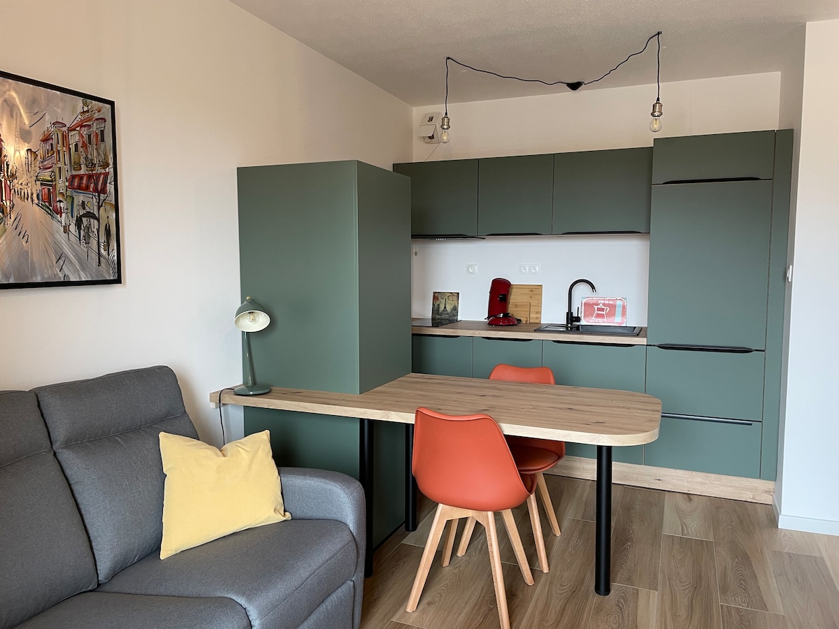 У самому центрі історичного центру Люксей-ле-Бен, біля підніжжя Тур-дез-Ешевен, La Chambre de l'Échevin розташована на першому поверсі відреставрованого історичного будинку, що поєднує в собі характер і сучасний комфорт. У квартирі є дві світлі спальні, одна з окремим робочим місцем, повністю обладнана кухня з посудомийною машиною та затишна вітальня з 50-дюймовим смарт-телевізором. Ідеально підходить для сімейного перебування, подорожей із друзями або ділових поїздок.
