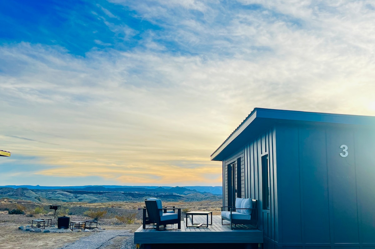 *10 MINUTES TO BIG BEND NATIONAL PARK *Private, but near everything! *Locally owned/operated! *324 sq ft charming Eco-friendly cabin for 2 adults (no kids) *COLD A/C, heat *Indoor&outdoor showers *Gas log fireplace *Super comfy Queen bed *Kitchenette *Full bath & clean compost toilet *Stunning views of Big Bend National park *Sustainable, SOLAR powered *Sunrise mountain views from your pillow *Incredible stargazing! *Come enjoy this unique desert gem, make memories of a lifetime!