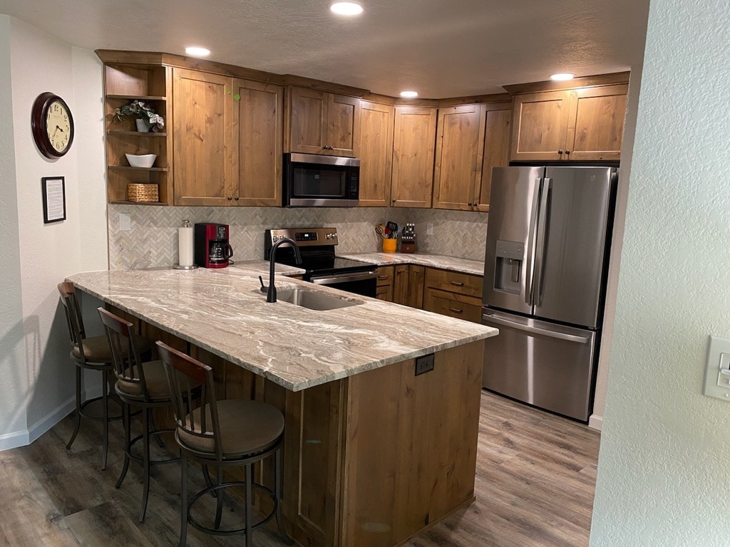 Beautiful modern quaint 1 bedroom condo with a rustic elegance for your family to enjoy at your stay in Brian Head, UT! Experience a stylish and relaxing getaway at our centrally-located place. Nicely furnished with a pillow top queen bed, bedroom set, 2 smart televisions, pillow top queen sofa sleeper pull-out bed, fully stocked kitchen and bathroom, and gas fireplace. Underground parking! Condo Amenities include pool/spa, exercise room, sauna, & laundry. Close to Navajo and Giant Steps Lodge