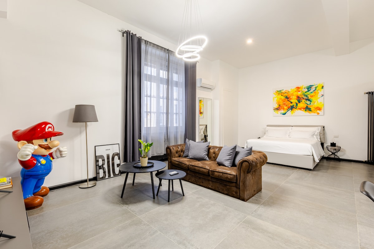 Красивий лофт з мезоніном, нещодавно відремонтований, розташований у центрі, за кілька кроків від історичної пішохідної зони, повної ресторанів і магазинів, дуже близько до човнового порту, залізничного вокзалу та фунікулера. Ми ретельно подбали про кожну деталь, щоб забезпечити вам незабутні враження. До будинку легко дістатися на автомобілі (поруч є багато паркувальних майданчиків) або на поїзді (станція Como Lago знаходиться в 5 хвилинах ходьби)