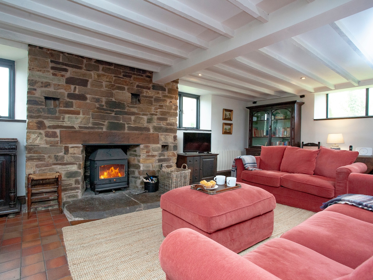 Окремий заміський будиночок на краю Дартмура. Розташоване на ухабній фермерській доріжці, поруч із приватним кінним господарством. Собаки вітаються. Добре обладнана кухня, якісні дивани та ліжка, безлімітний супершвидкий Wi-Fi, зарезервоване місце для паркування автомобіля з точкою зарядки електромобіля (див. нижче), центральне газове опалення та дров'яна піч для затишного перебування взимку, кондиціонер для комфортного перебування влітку.
