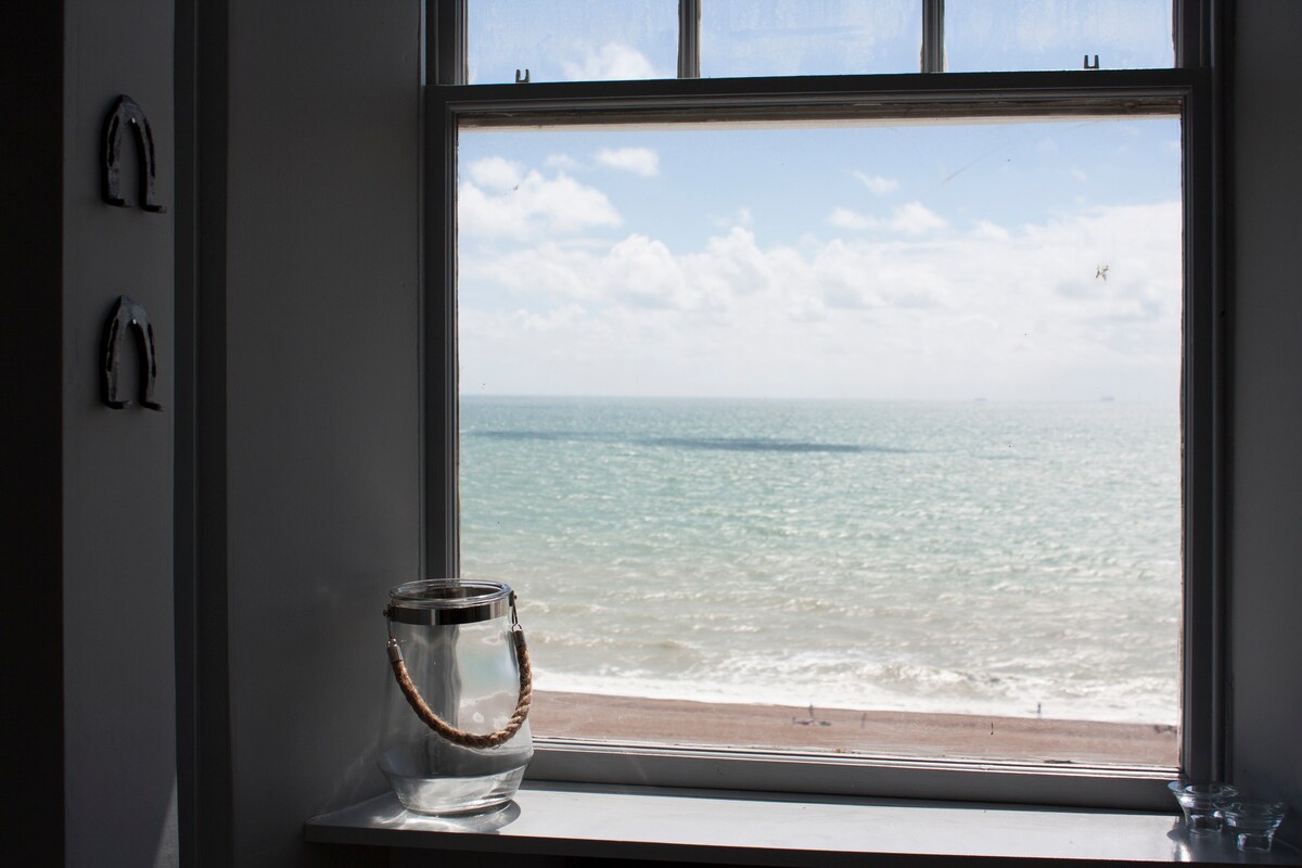 Насолоджуйтеся 5-зірковим перебуванням на набережній Брайтона – приголомшливий вид на море на 180° і балкон. Пляшка шампанського після прибуття 🍾 Уникайте стресу/витрат на паркування в Брайтоні завдяки власному паркувальному місцю. У культовій будівлі в стилі Регентства біля пляжу, за декілька хвилин ходьби до пірсу або Лейнс і багатьох ресторанів, у квартирі є все необхідне для чудового міні-відпочинку або тривалого перебування для пар, друзів або сімей. Повністю обладнана кухня, ванна кімната, ліжко з балдахіном, головна спальня з ліжком розміру superking або двома односпальними ліжками, пральна та сушильна машини, Sky TV.