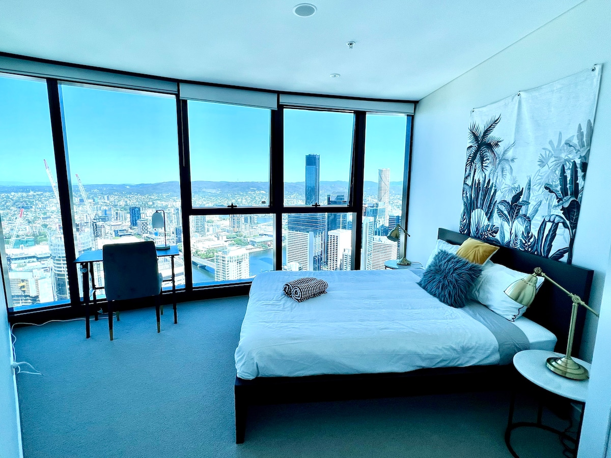 Зверніть увагу на цю квартиру з 2 ліжками та 2 ванними кімнатами на 48-му поверсі в центрі центрального делового району Брісбена. Безкоштовна автостоянка, Wi-Fi, а також приголомшливий критий басейн, зона для розваг/барбекю, шафки, парна та фітнес-центр на 66-му рівні. Висококласна простора квартира зі склом від підлоги до стелі з видом на Саутбанк і звивисту річку Брісбен - ідеально підходить для феєрверків! Без зайвих зусиль відвідайте найкращі ресторани, кафе, бари, магазини та розважальні райони Брісбена - усе це на вашому порозі.