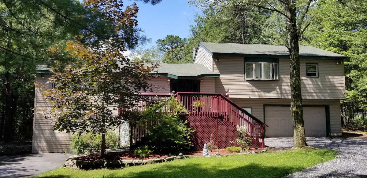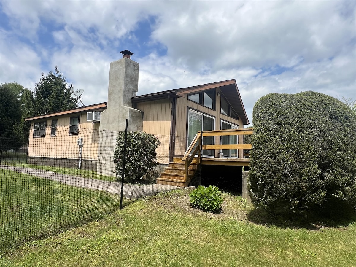 Цей комфортабельний будинок із повністю огородженим двором розташований у центрі гір Поконо. Це всього за кілька хвилин від гори Камелбек, аутлетів The Crossings Premium, рейстреку Поконо, критих і відкритих аквапарків, Аппалачської стежки та деяких найкращих місць для риболовлі та полювання в Пенсильванії. Помешкання має повністю огороджений двір площею 1/3 акра з виходом на терасу, включаючи меншу огороджену територію для вигулу собак у більш обмеженому просторі, ніж більший огороджений двір. У будинку можна перебувати з домашніми тваринами.