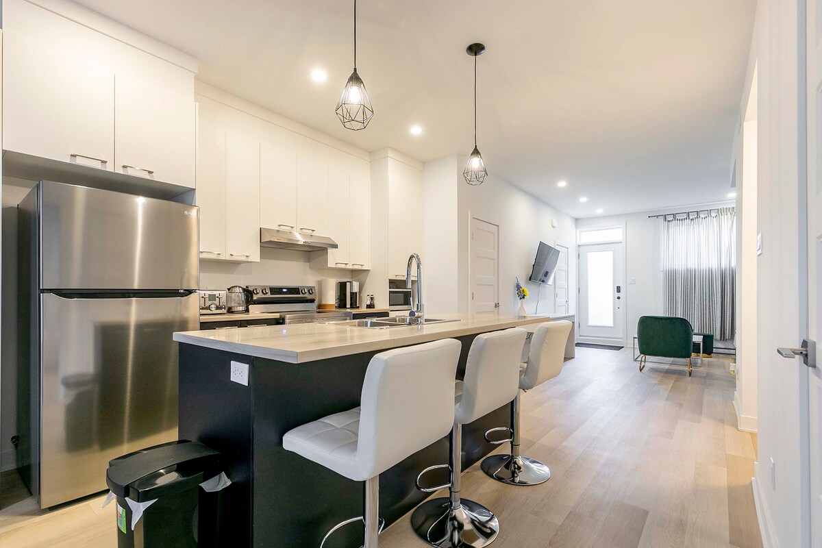 Charm & Luxury! This Stunning fully equipped 2 bedrooms apartment on 2 floors located in a brand new Triplex (2018) with a small balcony will provide you with a one of a kind experience. The place is close to family-friendly activities, river, park, bus stops, fast food, stores, supermarket, restaurant, public outdoor pool, convenience stores (dépanneur), bar, liquor store, pharmacy, etc. Suitable for couples, solo adventurers, business travelers, and families. Not suitable for groups
