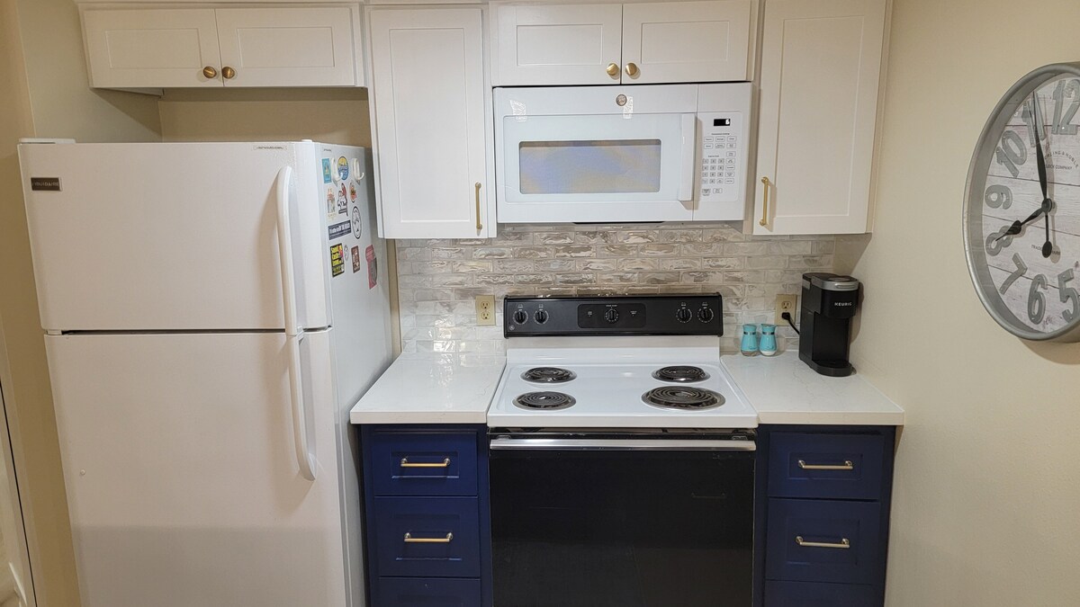 Ця простора двокімнатна квартира сподобається як гольфістам, так і не гольфістам. У помешканні є одна велика спальня зі склепінчастими стелями та вікнами, а також повноцінна ванна кімната. Надається одне ліжко розміру queen size, одне повнорозмірне ліжко та одне ліжко розміру twin size. Кухня повністю обладнана електричною плитою з чотирма конфорками, мікрохвильовою піччю та невеликим тостером. У помешканні є пральна та сушильна машини. Ми завжди раді нашим друзям на чотирьох лапах. Якщо ви приїжджаєте на операцію, у мене є спеціальні подушки для відновлення.