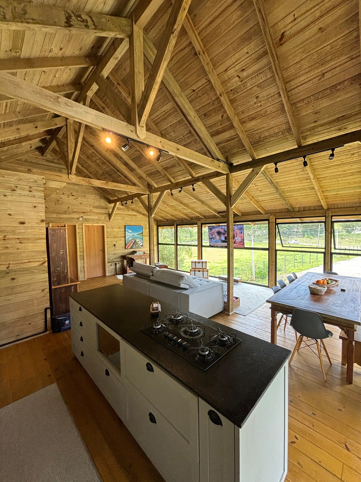 Шале в центрі природи, з сучасним і затишним дизайном, великими вікнами, з яких відкривається приголомшливий вид на гори. До послуг гостей камін, барбекю, паррілья, дров 'яна піч, джакузі під звуки струмка та повністю обладнана кухня. Проживання включає високоякісну постільну білизну та рушники. Розташоване в 20 хвилинах їзди від Ітахаї та в 30 хвилинах їзди від Balneário Camboriú, з швидким доступом до BR101. Ідеально підходить для тих, хто шукає відпочинку та комфорту в ексклюзивній та елегантній обстановці.