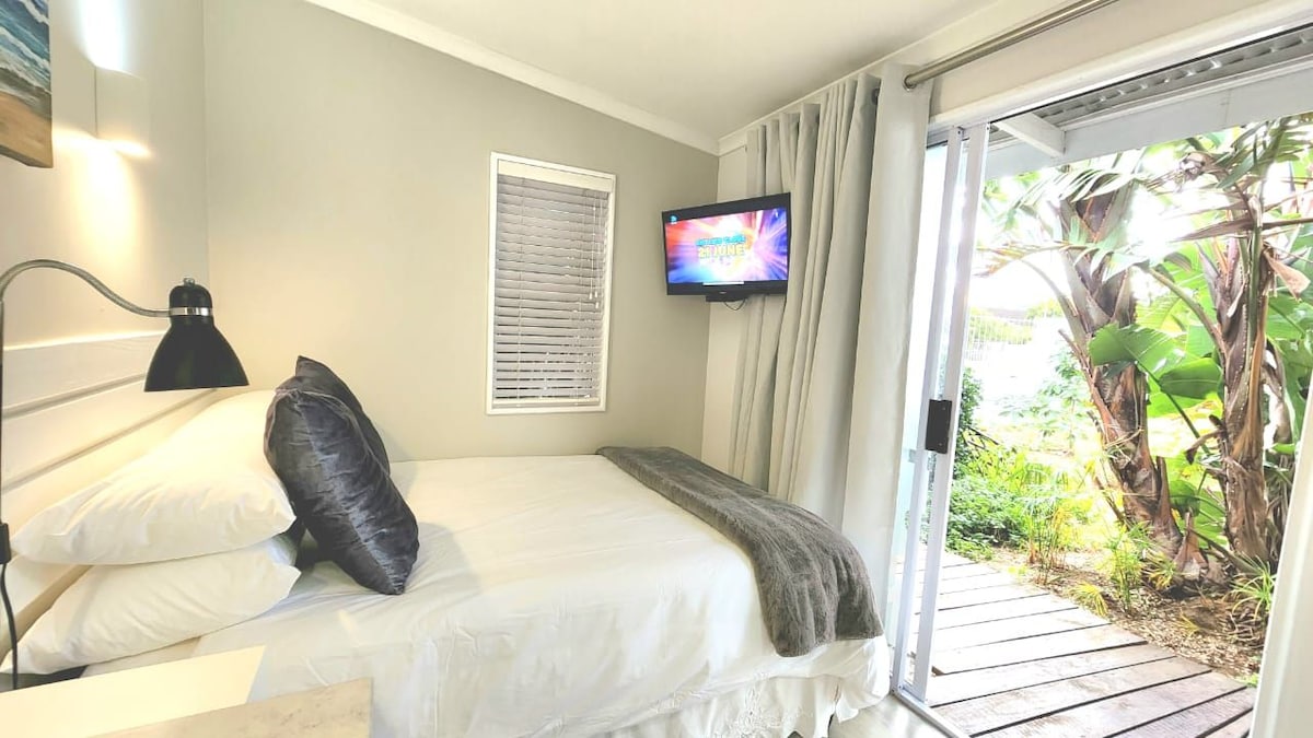Розташована на затишній дерев 'яній дорозі в вулиці Нахун. Наш гостьовий котедж відкритого плану пропонує ліжко розміру Queen size з високоякісною бавовняною білизною, безлімітний Wi-Fi, телевізор Smart TV високої чіткості, повний пакет DSTV та резервний акумулятор для відключення електроенергії. Добре обладнана міні-кухня з плитою та духовкою полегшує самообслуговування. Для тих, хто любить гуляти та бігати, ми знаходимося в 2 км від річки Нахун та пляжу. Spar і вибір чудових ресторанів і кав 'ярень також знаходяться в декількох хвилинах ходьби.