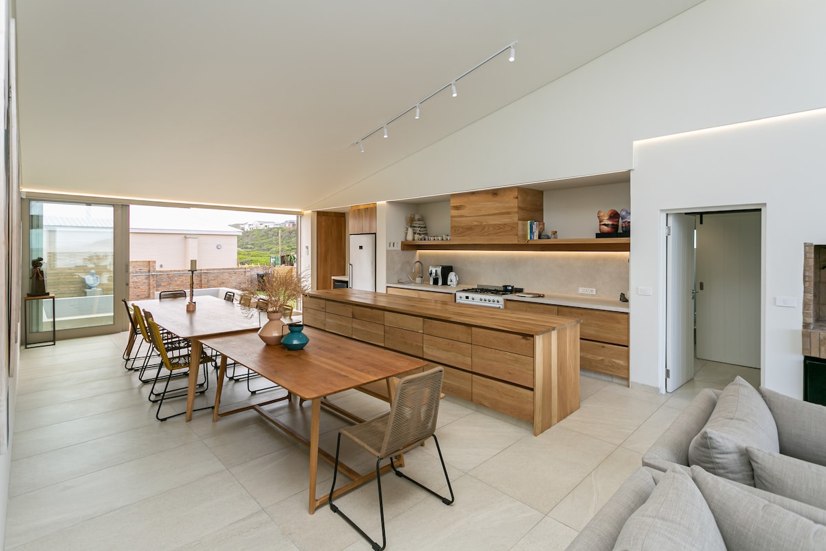 Відчуйте найкращий прибережний спосіб життя в нашому розкішному будинку на вершині скелі з приголомшливим видом на океан з кожної кімнати. Наш органічний сучасний дизайн має натуральне дерево та дизайнерські м 'які меблі. Пориньте в наш напівпідігрітий басейн, насолодіться нашою терасою для йоги та відпочинку або приготуйте їжу на нашій дизайнерській кухні. Укомплектована сонячною системою електроенергії та розташована в приватному заповіднику. Всього за 25 хвилин від аеропорту Джорджа, за 15 хвилин від торгового центру Garden Route Mall і Wilderness. Розслабтеся в комфорті та стилі.