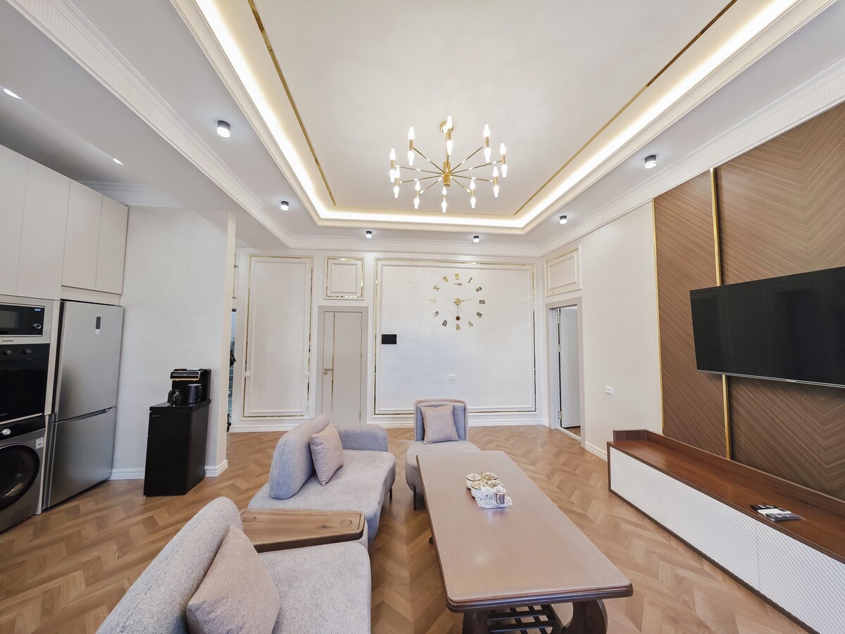 Насолодіться сучасною, простою квартирою площею 87 кв. м у центрі міста, всього за кілька кроків від торгового центру Bukhara Mall. У квартирі є 2 світлі кімнати з 1 двоспальним ліжком розміру King size та 2 односпальними ліжками, що ідеально підходить для сімей або груп. Готуйте вдома на повністю обладнаній кухні з усім посудом, великим холодильником, а також насолоджуйтеся безкоштовним Wi-Fi, телевізором і пральною машиною. Розташоване в жвавому районі поблизу магазинів, кафе та всього необхідного для комфортного та зручного перебування.