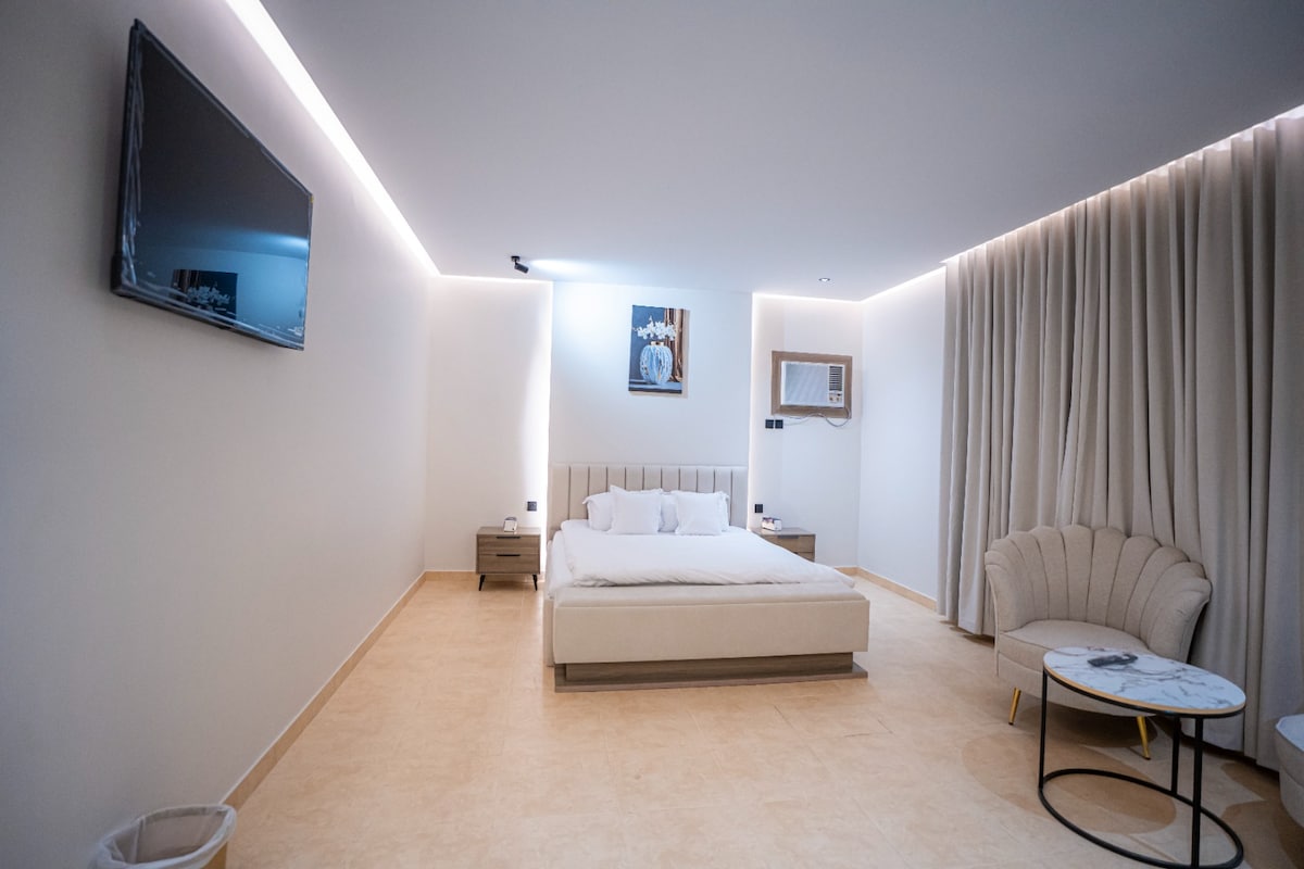 شقة أنيقة وعملية دخول ذاتي استمتع بإقامة هادئة ومريحة ، مناسبة للعائلات والأفراد، وتقع في موقع مميز قريب من الخدمات ، نظافة وتعقيم قبل كل ضيف قريبة من المطاعم، المقاهي، الأسواق والخدمات الأساسية. الديكور عصري، السرير مريح، والتلفزيون 75 بوصة! وفيه ركن قهوة وضيافة يفتح النفس والموقع؟ هادئ وقريب من كل شي ، وكل اللي تحتاجه. والمواقف متوفرة قدام الباب مناسبة جداً لرحلات العمل أو الإقامات القصيرة. احجز واستمتع بتجربة بسيطة ومريحة!