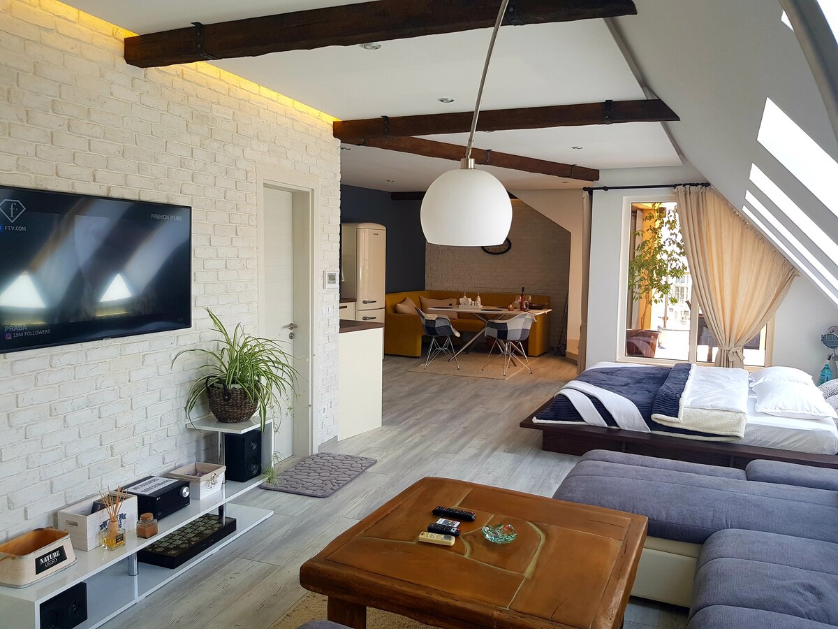 Вітаємо! Ми будуємо цю приголомшливу мансардну квартиру-студію, щоб вітати гостей у нашому прекрасному місті на узбережжі Чорного моря. Центральна частина міста є пішохідною зоною і славиться своїми чудовими ресторанами та магазинами. Район є улюбленим місцем для багатьох туристів та молоді. Наші гості можуть насолоджуватися затишною прогулянкою біля пляжу або відчути ритм нічного життя в чудовому морському саду, де можна знайти безліч атракціонів. Заходьте! Вам сподобається, і ви запам 'ятаєте це назавжди!!!