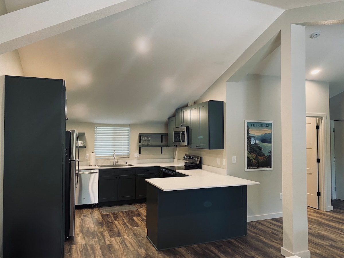 *Professionally Cleaned* Cozy, modern, and beautiful, the updated decor in this basement studio apartment, sets it apart. This studio is nestled in the heart of downtown Vancouver. Here you will find yourself only 20 mins from PDX and less than 30 mins to DT Portland. This kitchen includes a dishwasher, fridge w/bottom freezer, countertop appliances, and a dining space for two. This apartment is fully equipped with all the extra amenities to include a full size washer and dryer set.