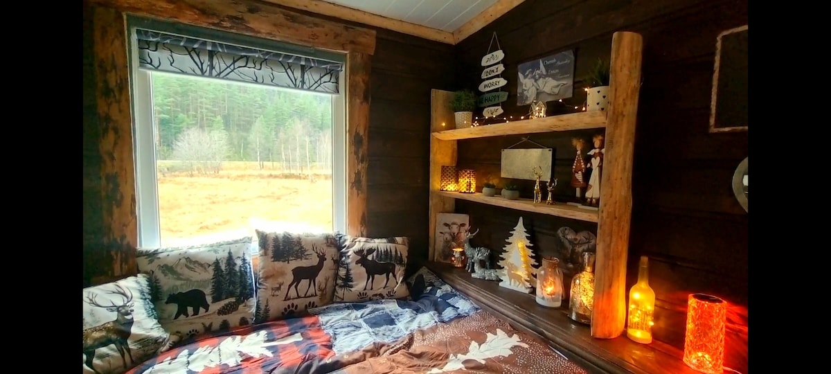 Liten hyttevogn med vedovn ved siden av en liten elv/bekk. Naturskjønt beliggenhet. Vogn har solcellepanel til lys og vedovn til oppvarming. Bålplass utenfor. Mulighet også å leie badestamp og tønnebadstue / sauna mot ekstra betaling. I sauna kan du vaske deg med varmt vann. Robåt til gratis lån. Plassen passer fint til dem som liker seg I naturen med enkel standard overnatting. I høst/ vintertid fra ca 15.9 - 1.5 er vogna sammen med eget privat ute-kjøkken. Hund tillatt