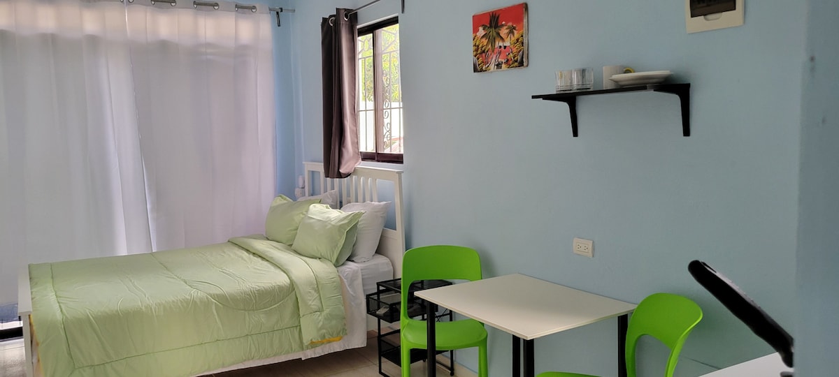 Este es el alojamiento ideal para tu escapa y aventuras .Nuestra propiedad te permite poder visitar los mejores lugares de la zona ya que estamos ubicados en mismo centro de Cabrera. Una habitaion : Cama Qeen size A/C Baño completo 1 , agua caliente Cocina /sala estar equipada completamente Wifi , Tv, A/C , Abanicos , Secador de pelo, closet, plancha, Ropa de cama .