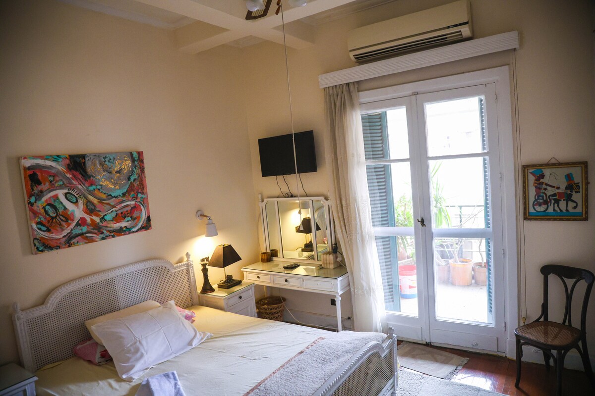 Відчуйте комфорт і елегантність у нашій просторій кімнаті з двома затишними ліжками, плюшевим диваном і двома привабливими стільцями. Насолоджуйтеся кондиціонером, високошвидкісним Wi-Fi, телевізором із плоским екраном та вентилятором. Вийдіть на власний балкон, щоб насолодитися яскравими пам 'ятками та звуками центру Каїра. Побалуйте себе нашою вінтажною їдальнею та вітальнею з дорогоцінними меблями та готуйте на нашій повністю обладнаній кухні. Ваше ідеальне помешкання для ознайомлення з Каїром чекає на вас. Забронюйте зараз і зробіть незабутні спогади!