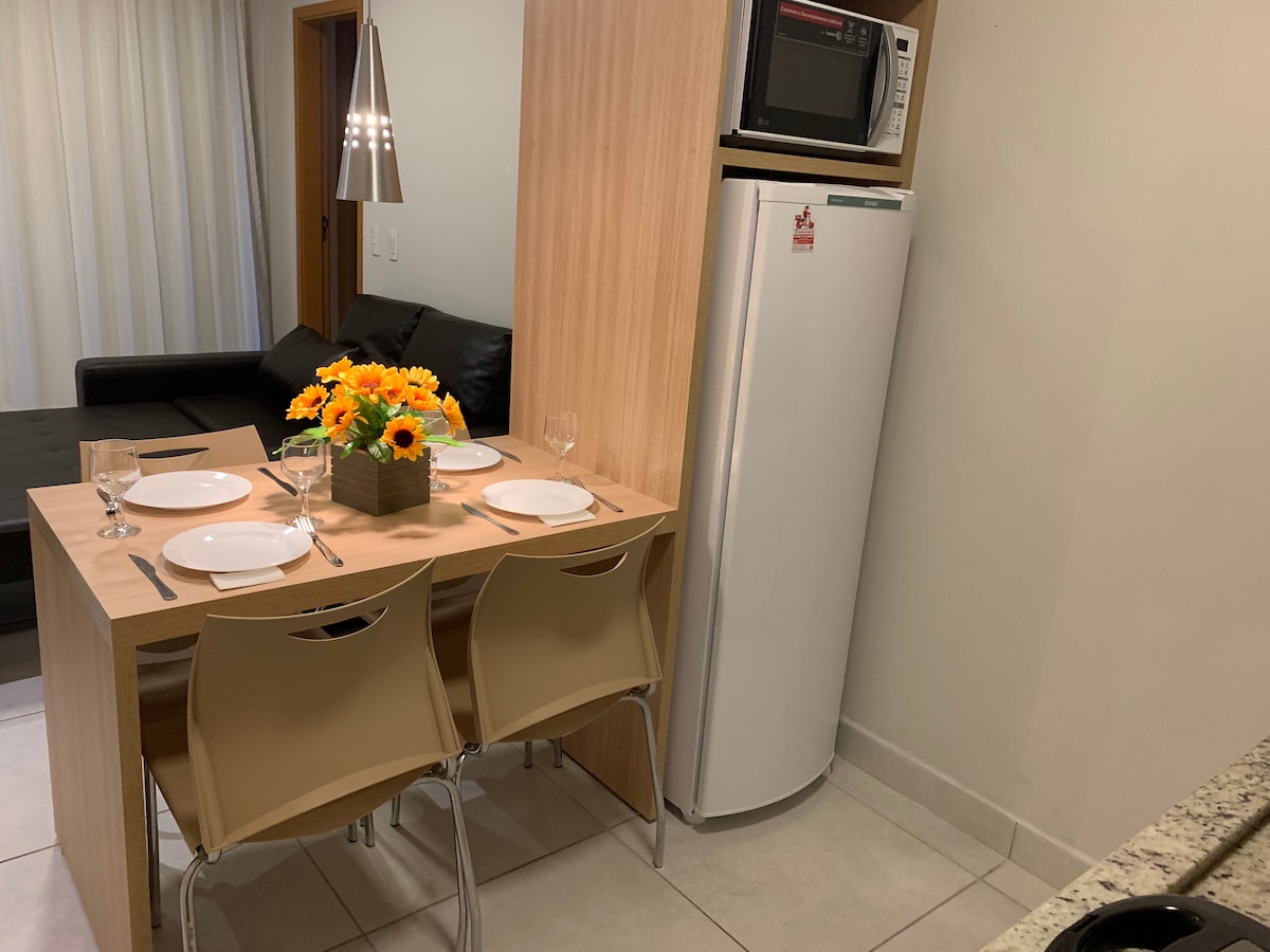 Барбекю на вугіллі всередині квартири, балкон з видом на басейн, доступ до 6 басейнів з теплою водою, 3 гідромасажні ванни, ви можете брати напої та їжу до басейнів: споживання за столиками. У кондомініумі є сауна, ігрова кімната, ігрова кімната; у парку є зона для куріння, дитячий майданчик, 1 паркомісце включено в бронювання, 700 метрів від центру Калдаса. Кондиціонер; телевізор (вітальня та спальня); Wi-Fi; блендер; кавоварка; плита; мікрохвильова піч; вентилятор; посуд та кухонне приладдя.