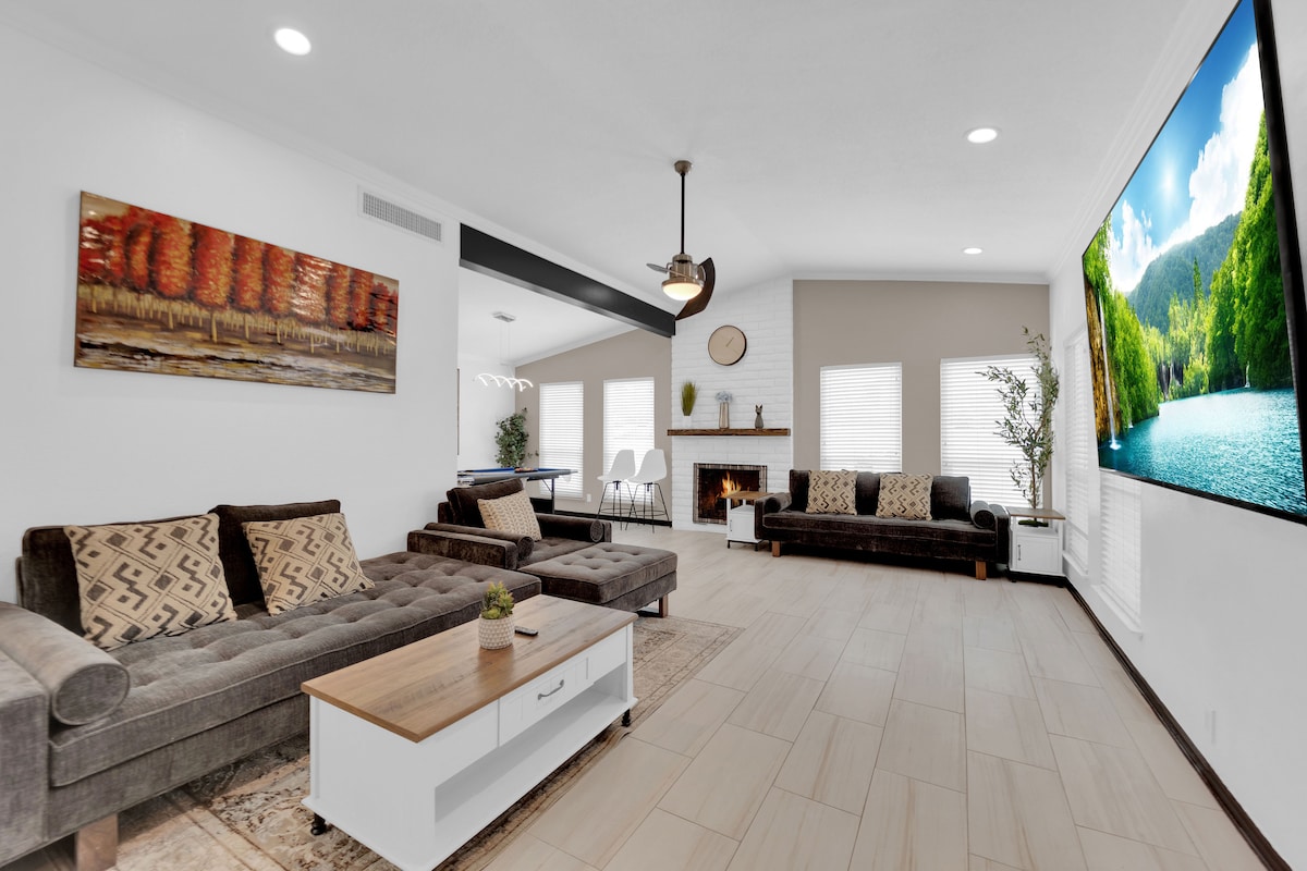 Ласкаво просимо до мого сучасного повністю відремонтованого будинку площею 1900 квадратних футів! Баскетбольний майданчик, гольф, постановка зелених настилів і настил зі стрічковим видом. Затонула зона сидіння ями. Будинок побудований у 2019 році і до 2022 року в ньому ніхто не жив. Дивовижно красиві краєвиди з заднього двору та будинку. Дуже просторий і зручний для розміщення до 8 осіб. Басейн з підігрівом на 25 футів та джакузі. Високошвидкісний інтернет і базова передплата за кабель. У кожній спальні є власний розумний телевізор, а у вітальні є величезний розумний телевізор.