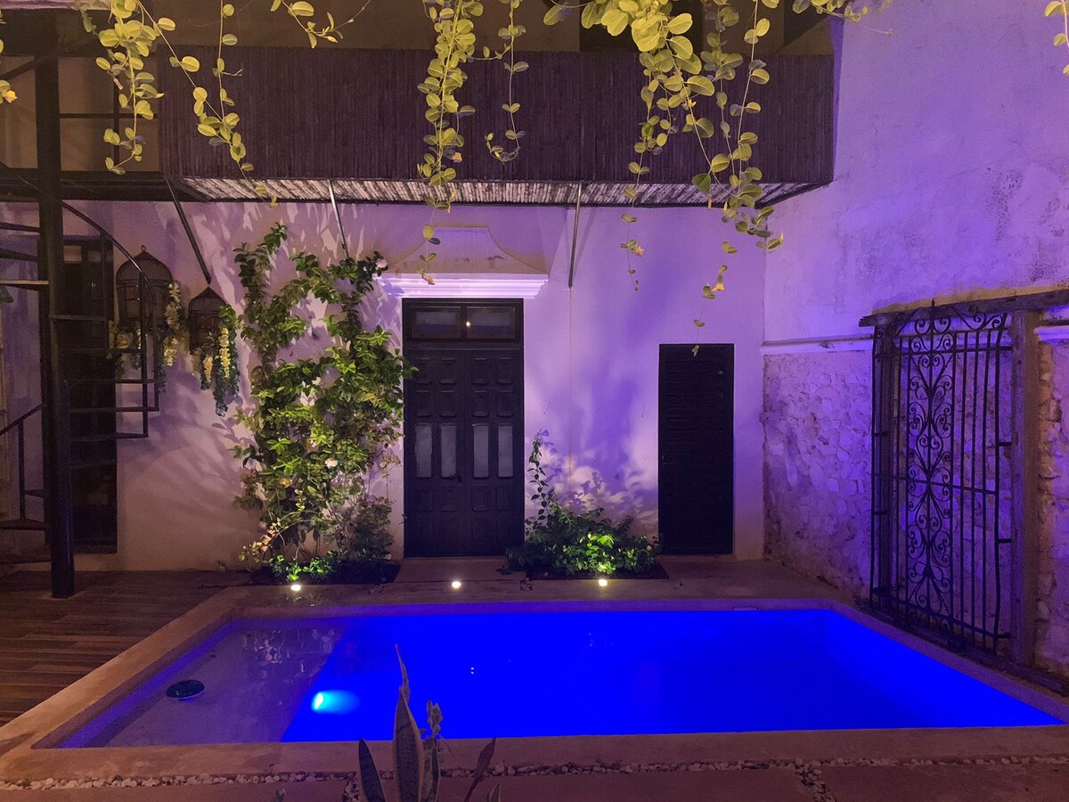Чудовий будинок XVIII століття в центрі Кампече. Розташоване в районі Сан-Франциско, одному з найстаріших у Кампече. Ви можете прогулятися до огородженого району міста, океанської доріжки, ботанічного саду, собору та всіх пам 'яток у центрі Кампече. До ресторанів, пекарень, супермаркетів і зручних магазинів можна дійти пішки. Вітальня та їдальня, кухня, патіо, веранда, телевізійна кімната, басейн та барбекю. Будинок має 4 спальні та 3 ванні кімнати. Чудове місце для відпочинку після дня.