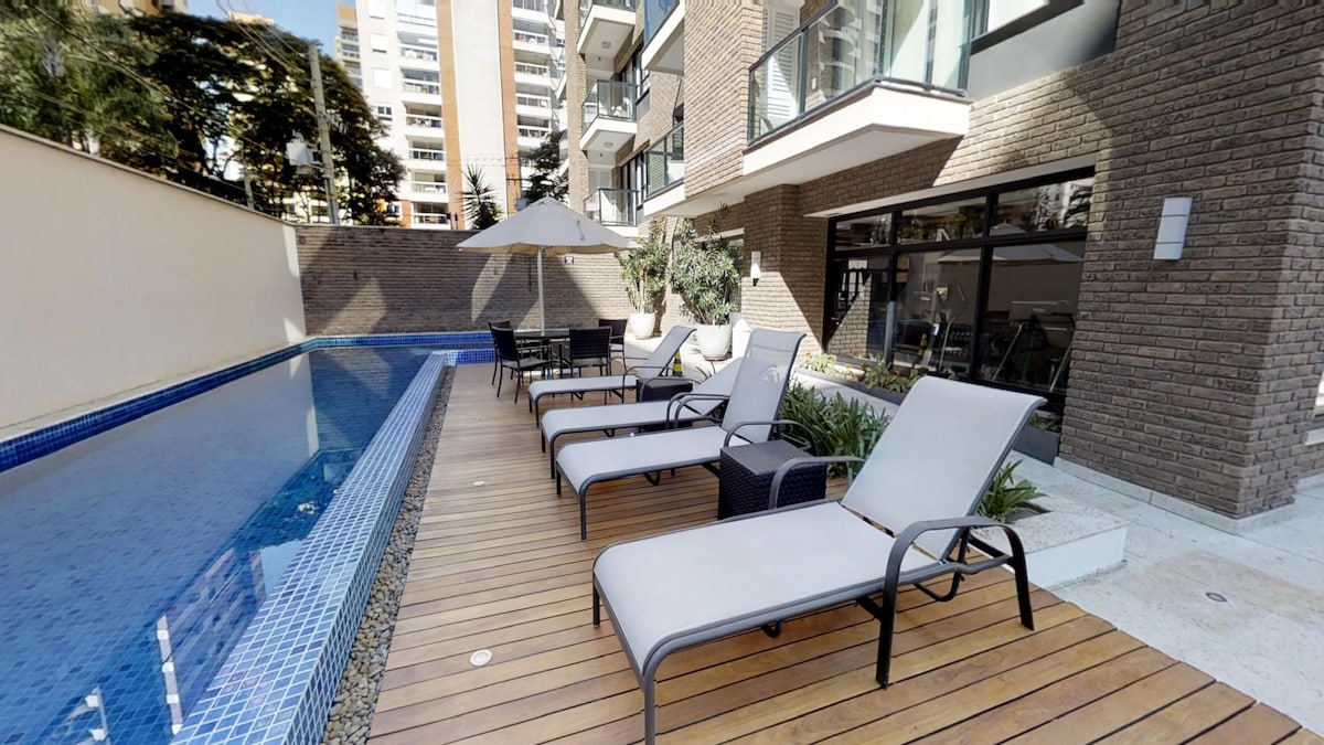 Квартира в лофті, нова, з матеріалами надзвичайно хорошого смаку в найчарівнішому і добре розташованому районі Кампінас. Він має повністю обладнану кухню, з найсучаснішим обладнанням, вітальня з телевізором, туалет, люкс з двоспальним ліжком. Гуртожитковий балкон з барбекю. У загальних зонах ОСББ є басейн, барбекю, кімната для вечірок, зал для засідань, тренажерний зал та пральня. Гість може насолоджуватися всім, але він не може брати гостей у ці зони. 2 паркувальні місця