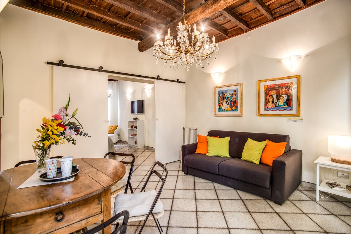 БЕЗКОШТОВНИЙ WI-FI і затишне розумне робоче місце. Чарівні апартаменти з однією спальнею площею близько 50 кв. м, розташовані на розі Кампо-де-Фьорі та на другому, верхньому поверсі стародавнього палацу XV століття, відомого тим, що він був протягом століття «Inn of the Cow», що належить Ванноцце, куртину та любителю кардинала Родріго Борджіа. Стратегічне розташування, легка прогулянка до найцікавіших історичних та кулінарних об 'єктів центру міста. Чудово відремонтований, повністю обладнаний і зручний.