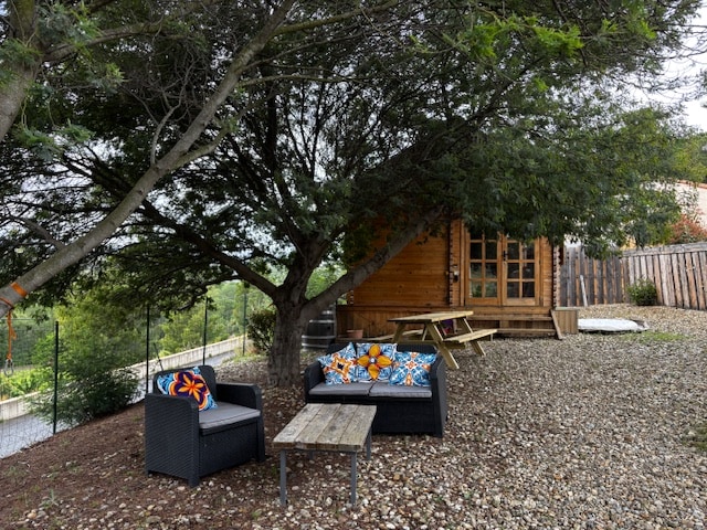 Невеликий будинок площею 6 кв. м з критою терасою та великою підвісною сіткою для відпочинку, розташований посеред дерев у тихому місці. Перша людська присутність (ми!) за 200 м: ви будете на самоті посеред лісу. Пішохідний доступ на 300 м має круту частину схилу. У номері є кава та чай. Ми пропонуємо домашнє харчування. Постільна білизна надається, рушники не надаються. Спілкування через Airbnb, оскільки телефон погано відповідає нам (у зрубі це добре).