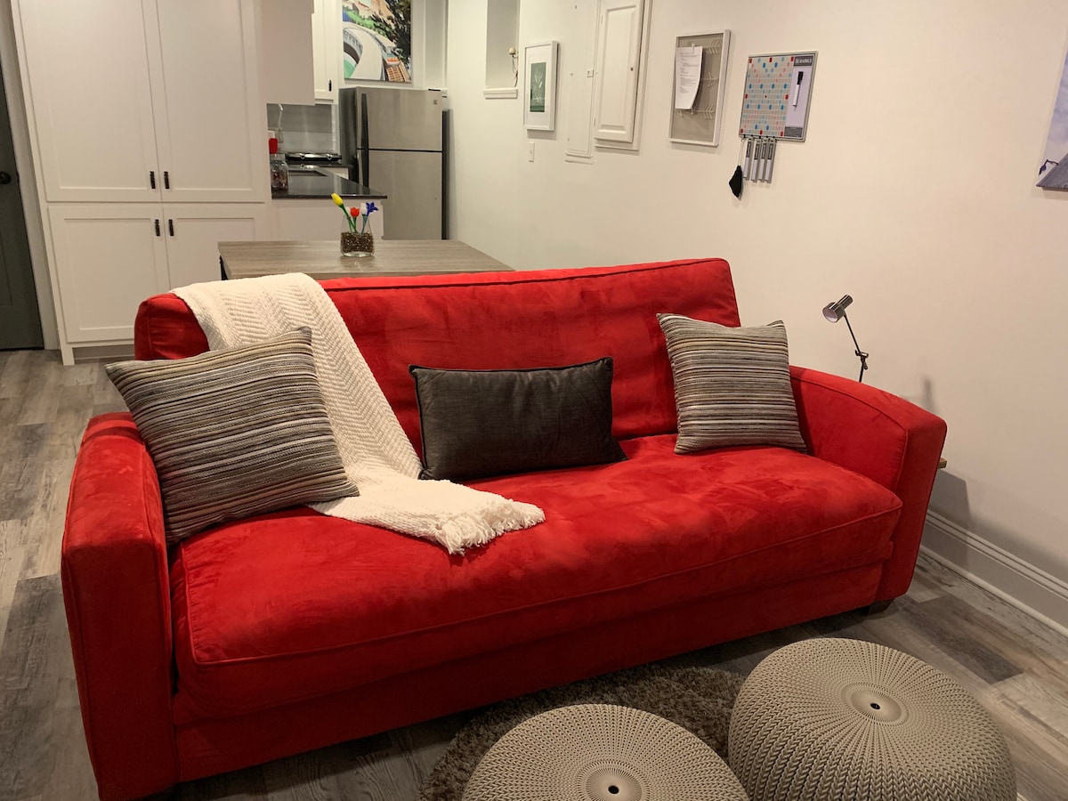1 велике ліжко размера King size в Каліфорнії та 1 довгий диван, який підходить для сну. Ванна кімната повністю обладнана для всіх ваших потреб. Wi-Fi, простирадла, подушки, ковдри, рушники, туалетні засоби, фільтрована вода та кавоварка (з територією) надаються для кожного гостя. Мікрохвильова піч і міні-холодильник знаходяться на верхньому поверсі. Гості також можуть відпочити в нашому прекрасному задньому дворі, де є набір крісел Adirondack. Гості увійдуть через задній двір на невеликий набір зовнішніх сходів. Мы предоставим вам ключ-код для входу.