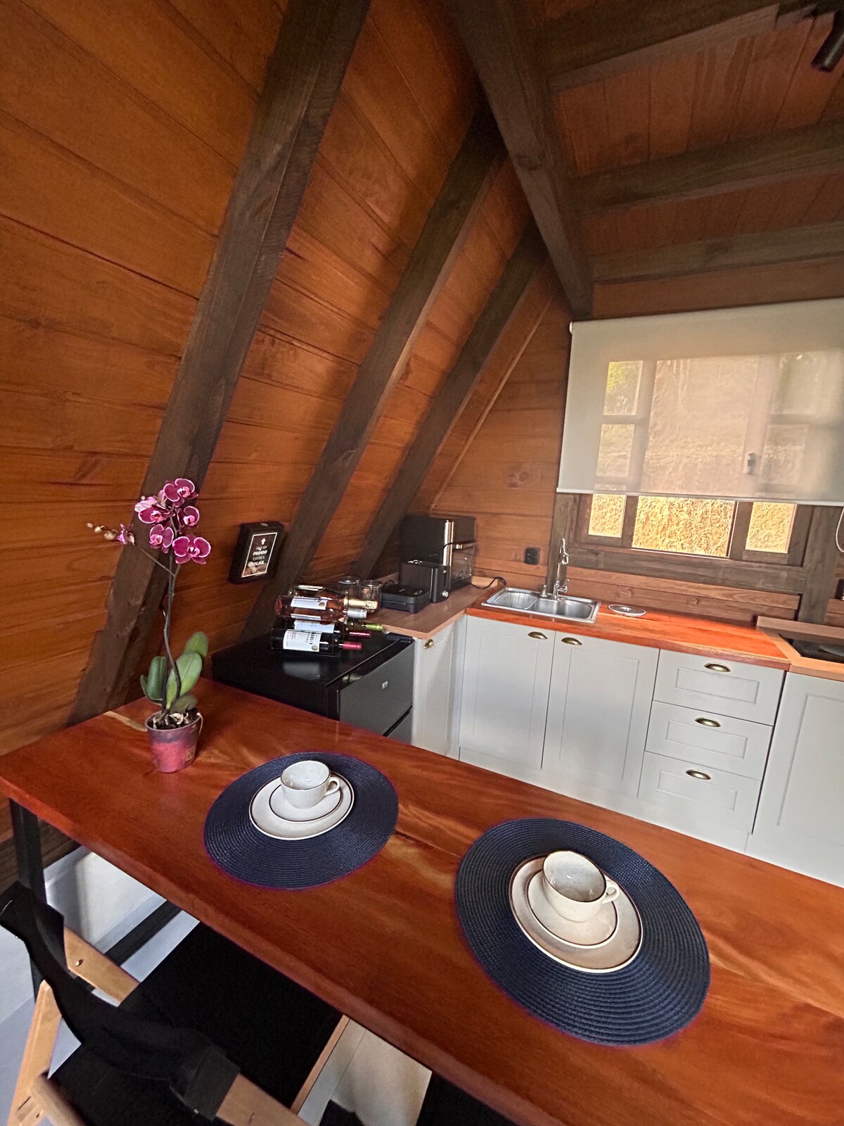 Nossa cabana rústica acomoda até 3 pessoas e oferece uma cozinha compacta equipada, quarto com móveis de madeira e janelas com vista para o lago e árvores frutíferas. O banheiro é simples, mantendo o estilo rústico. Charmosa e confortável, é perfeita para quem busca relaxar em meio à natureza, aproveitando a tranquilidade do entorno. Refeitório completo disponível no local, com café da manhã, almoço e jantar à parte.