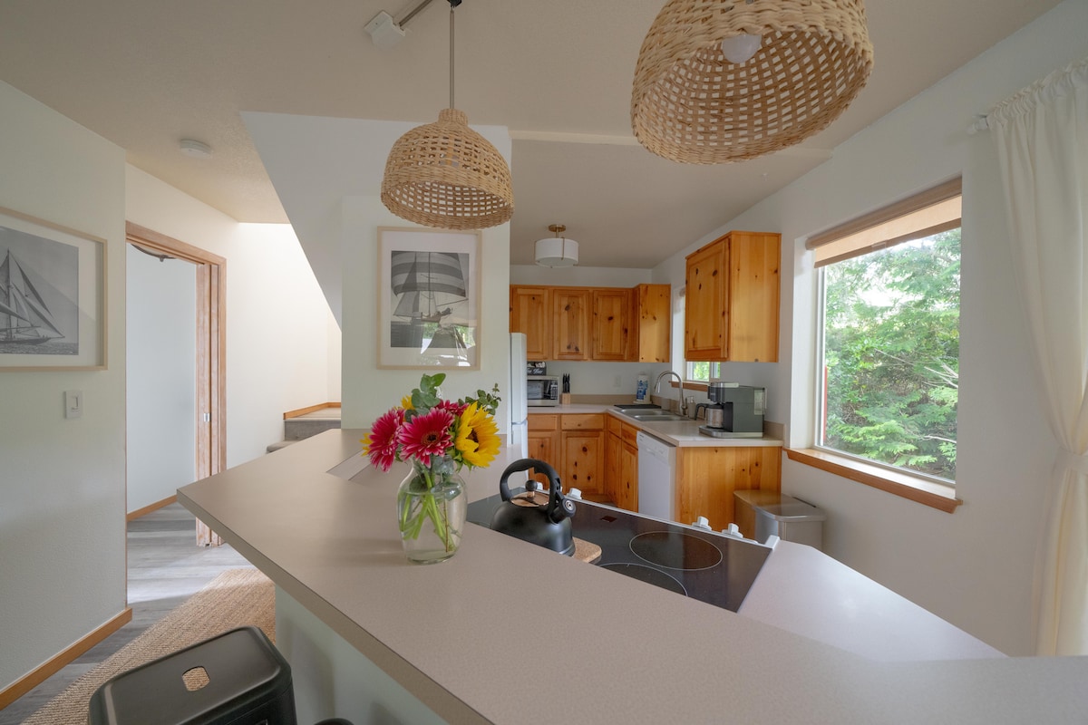 Оновлене помешкання розташоване на схилі пагорба в Оушенсайді з приголомшливими краєвидами з усіх 3 рівнів. Балкон із газовим барбекю біля вітальні з видом на 3 Арч-Рокс і Кейп-Лукаут. Будинок може похвалитися унікальною бочковою стелею, теплими дерев’яними підлогами та оздобленням. Кухня була оновлена, з шафами, стільницями, плиткою та приладами SS. Вишукане поєднання оригінальної архітектури та сучасного оновленого відчуття. Рай для віддаленої роботи з робочим столом у лофті. Високошвидкісний Інтернет.