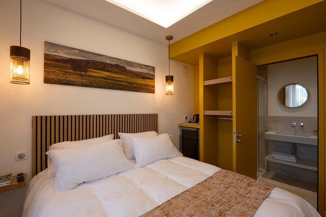 Жовтий, нагадування про нарцис і колір благополуччя, додає тонізуючу примітку до цієї заспокійливої кімнати. Справжній кокон (це найменша з п 'яти спалень), Джонкіл пропонує вам чарівний вид на село з видом на восьмикутну дзвіницю церкви. Оздоровчий варіант ( джакузі, басейн, халат, сандалі) коштує 15 євро/день/особа.