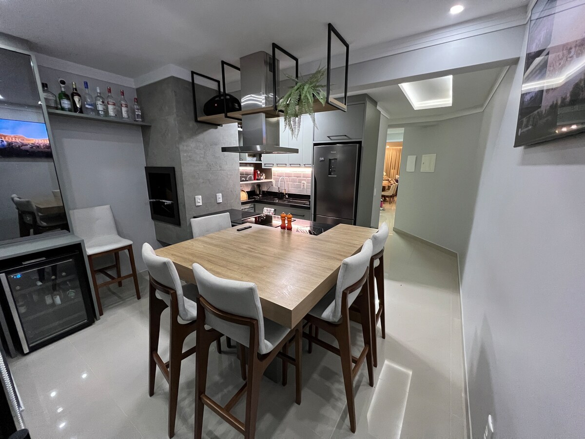 Чудовий будинок в унікальному стилі шале в Canto da Praia в Ітапемі. Одне з найкращих місць, недалеко від моря, пристані, центрального пляжу Ітапема та райських пляжів. Будинок із великою вітальнею з каміном, двома кухнями для прийому вашої сім 'ї та/або друзів. Окрім унікального стилю, будинок дуже просторий і затишний, що є унікальним враженням. Окрім захоплюючого краєвиду, тут є безкрайній басейн. Приємного враження!