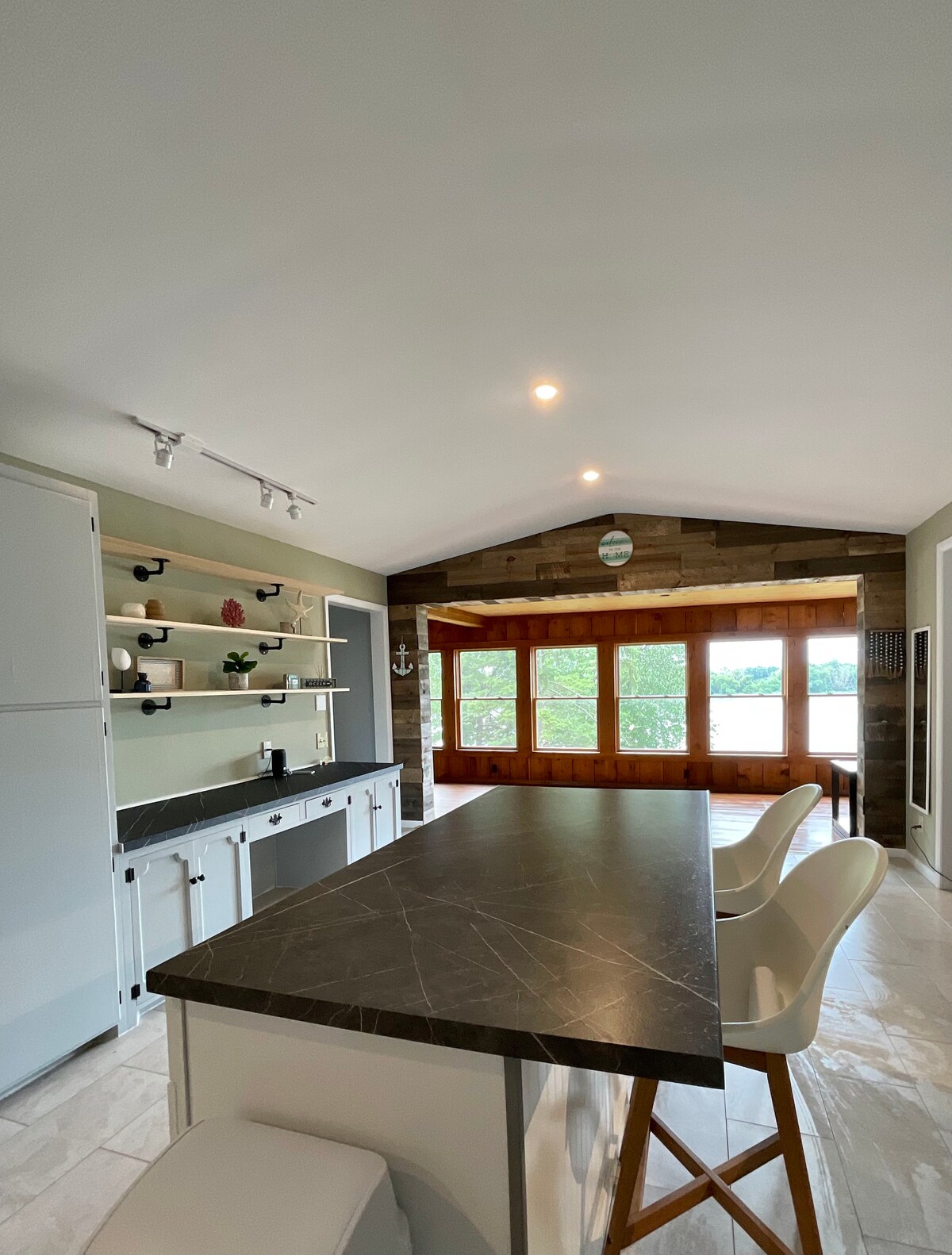 The South Bank Loft features a large, open studio style living space highlighted by gorgeous floor to ceiling windows overlooking historic Main Street in Havana, Illinois. The space has been meticulously restored and boasts high twelve foot ceilings, original restored crown molding, exposed brick and original hardwood maple floors. The loft also features a kitchenette with high end cabinetry, custom tile back splash and under cabinet lighting.